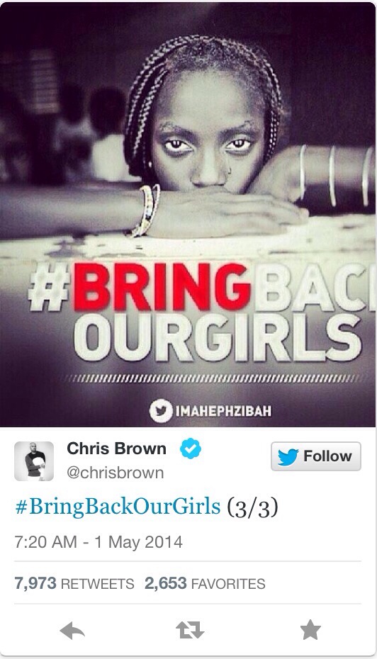 Le chanteur incarcéré Chris Brown a ainsi que son ex petite amie et plusieurs célébrités unissent leurs force pour soutenir les jeunes nigérianes kidnappées il y a déjà plus de deux semaines.