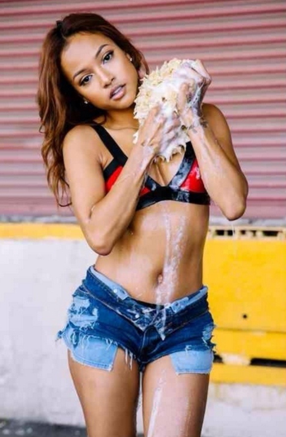 Karruche Tran pose pour DeLorean, avec la fameuse voiture du film Back To The Future. Elle apparaît dans une pose sexy en train de laver une voiture, dans un mini short, un bikini rouge et noir.