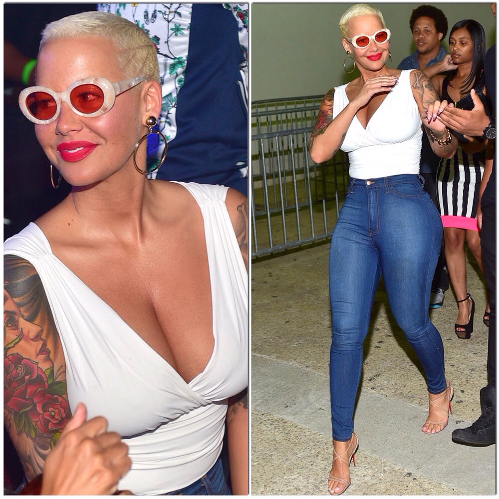 Amber Rose a choisi de porter un pantalon jean bleu extrêmement slim et tellement serré qu’elle avait du mal à marcher. Elle avait un haut col V plongeant et une paire de lunettes quasi transparente.