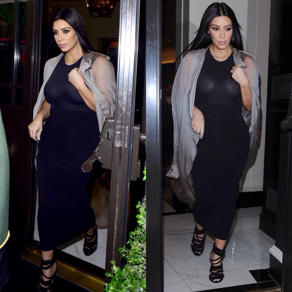 Âgée de 34 ans, Kim Kardashian est sortie de l’hôtel vêtue d’une robe noire transparente et sans soutien-gorge.