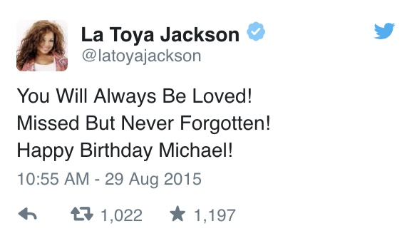 Sa soeur La Toya Jackson a affirmé que la musique de son frère apporrait beaucoup de joie et qu’elle représentait un cadeau que l’on aura toujours avec nous. Elle a ajouté que Michael Jackson sera toujours dans nos coeurs, qu’il nous manquera toujours et que l’on ne l’oubliera jamais. Elle a twitté: