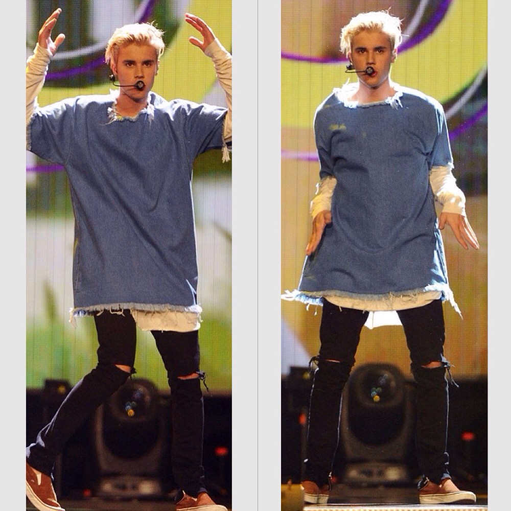Pour le coup, Justin a porté un pantalon slim avec déchirures et coupures. Il portait une sorte d’énorme haut en denim bleu.