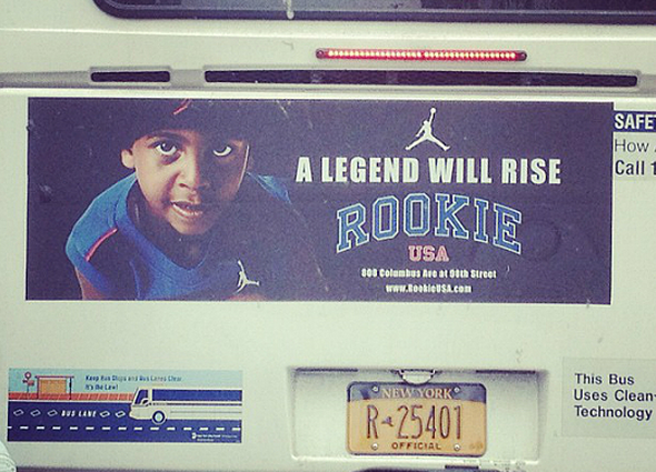 Kiyan Anthony, fiks de Carmelo Anthony joueur de basketball à la NBA et de Lala Anthony actrice de “Basketball Wives” devient le nouveau visage de RookieUSA et Jordan Kids. Ses photos publicitaires font le tour de New York. En témoigne une photo à l’arrière d’un bus urbain de Manhattan: