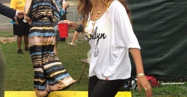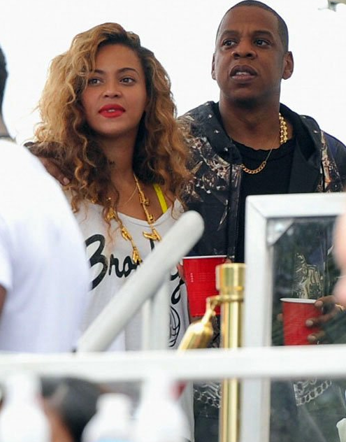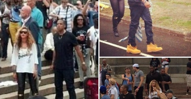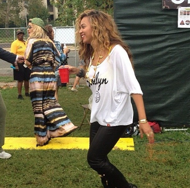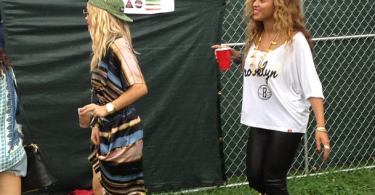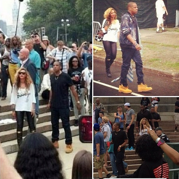 Les Carter se sont fais des câlins alors que le temps était pluvieux, le jour 2 (dimanche). Hov & B sont arrivés hier après-midi au festival “Made in America”. Juste à temps pour voir Run DMC sur la scène Rocky. Le duo a été repéré main dans la main alors qu’ils regardaient Run DMC juste en face de la scène.