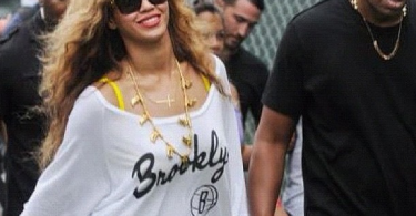 Beyonce portait une chemise de Jay-Z des Nets (équipe Brooklyn) et des jambières en cuir noir avec cuissardes talons aiguilles hauts.