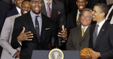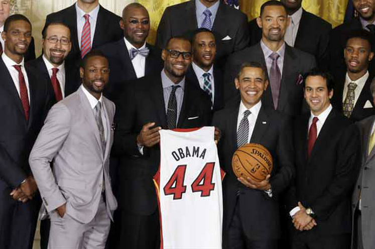Barack Obama a reçu l’équipe de Basketball NBA de Miami à la Maison Blanche. Les joueurs de la NBA de cette équipe dont LeBron James, Dwayne Wade et Ray étaient présents. Certains joueurs sont venus à la Maison Blanche en compagnie de leur conjointe, épouse ou petite amie. Parmi elles, Adrienne Bosh et Gabrielle Union qui par ailleurs était fière de rencontrer et poser avec Barack Obama.
