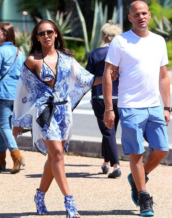 Mel B portait un kaftan assorti à son bikini et ses chaussures à talons.
