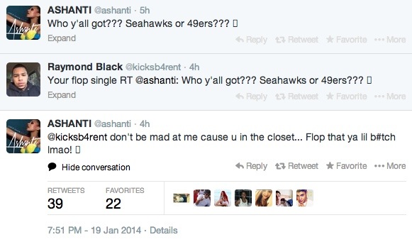 Attaques • Sujets de twitter Ashanti accusée de tous les noms sur Twitter 12 years agoPar Brenda TIATIAjouter un commentaire71 Vues Rédigé par Brenda TIATI La chanteuse a peut-être cru bien faire mais s’est rendue coupable à cause de ses tweets adressés à un de ses followers mécontents. Ashanti n’a pas accepté les mots du follower en question et a vivement réagi: Articles similaires:Ashanti dévoile son nouveau morceau “She Can’t (Like Mine)” On aurait dit que Ashanti cherche le rythme de son ancien album "Braveheart". Son […]Ashanti présente Braveheart L'album de Ashanti est enfin dans les bacs... Depuis le temps que les fans […]Ashanti affronte le froid new-yorkais pour se rendre sur le plateau de The Today Show Alors que l'hiver s'installe, de nombreuses célébrités ne veulent pas toujours se […]Ashanti serait en couple avec le sportif Darnell Dockett On dirait que Ashanti a trouvé un homme qui occupe une partie de son temps […]Ashanti présente son nouveau single Christmas in the City Dans quelques jours, Ashanti devra faire à ses fans avec Christmas in the City diffusé […]