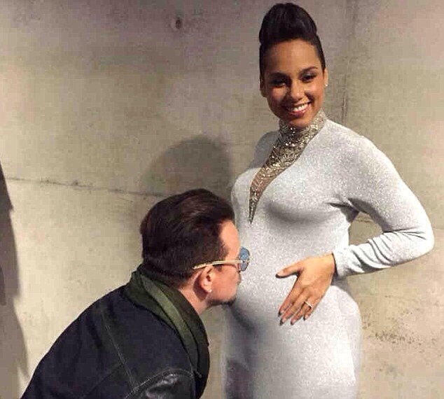 Bono de U2 a fait un bisou sur le ventre de Alicia Keys qui est toujours enceinte de son deuxième enfant.