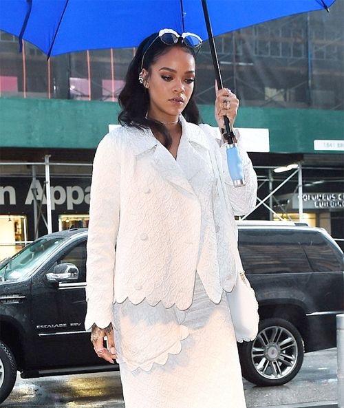 Rihanna portait une veste blanche Simone Rocha, une robe Simone Rocha et une paire de chaussures basses blanches Simone Rocha.