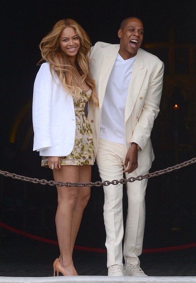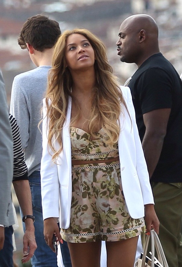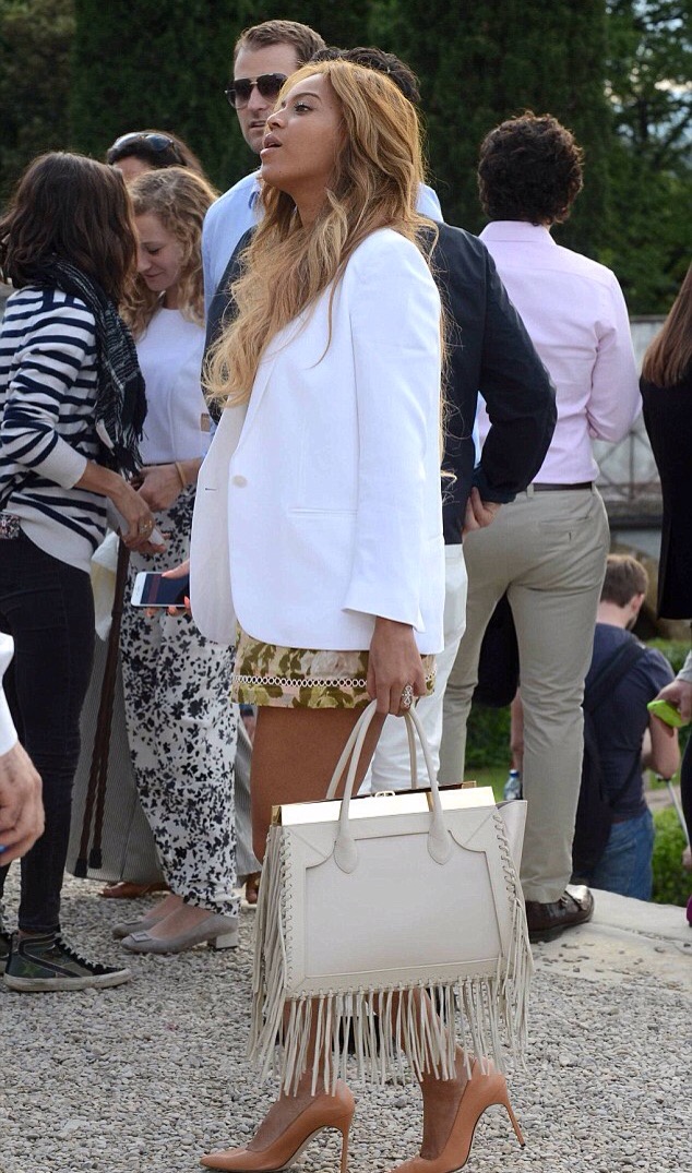 Pour leur visite, Beyonce portait une mini robe fleurie et une veste blanche par dessus. Elle avait les cheuveux blouclés au vent, une paire d’escarpins couleur chair et un sac à main caba couleur écru en en guise d’accessoires.