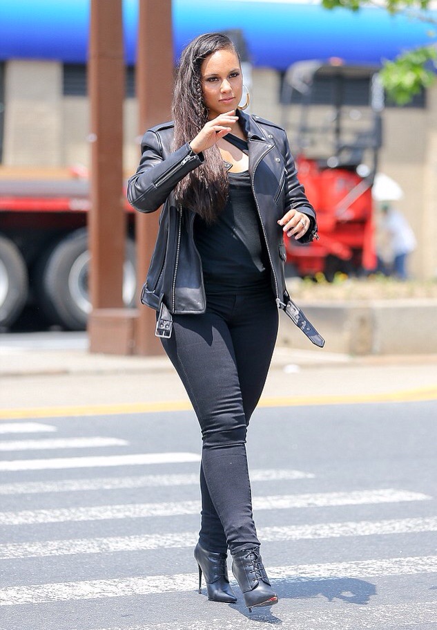 La chanteuse Alicia Keys était dans les rues de Harlem. Elle était tout de noir vêtue, portant un pantalon en cuir, une veste en cuir, un haut noir et une paire de bottes à talons noirs. Elle avait des mêches tressées et les cheveux rasés sur le côté.