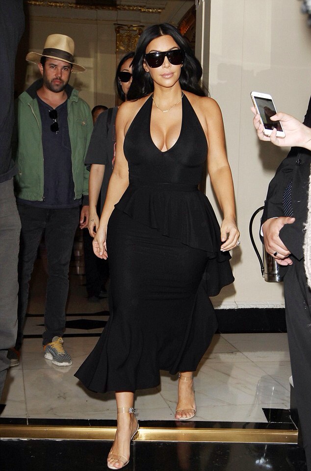 Kim Kardashian portait une robe noire avec un V plongeant sur sa poitrine. Elle est actuellement en tournée à Londres.
