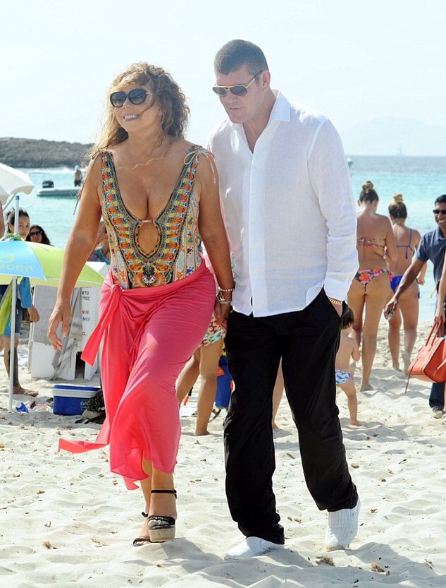 La chanteuse de Touche My Body, Mariah Carey portait un maillot de bain que’elle a couvert par un long paréro rose. A ses pieds, elle a mis une paire de sandales à très hauts talons.