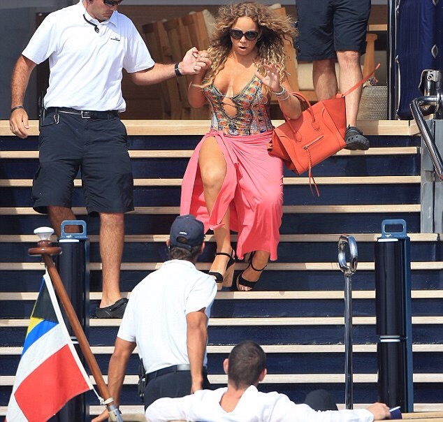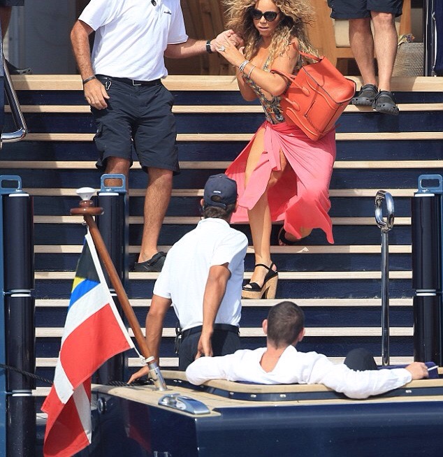 Alors la maman de Morocco et Monroe descendaitnles marches d’escaliers du grand yatch, Mariah Carey a failli tomber. Elle a été sauvér par les gros bras d’un garde du corps. Son homme regardait la scène tout en savourant une cigarette.