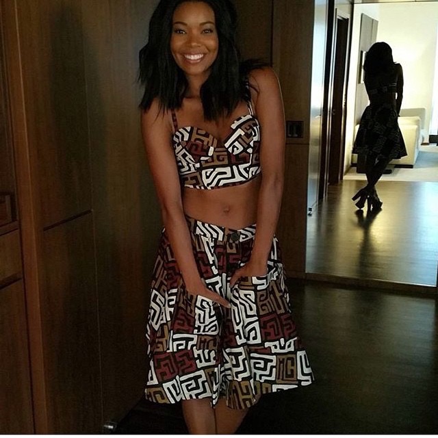 Pour sa sortie nocturne à à New York City, Gabrielle Union a décidé de faire confiance à une création locale. Elle portait un ensemble corser et jupe mi-longue en tissus pagne.