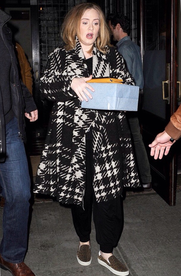 Adele portait un manteau aux motifs noirs et blancs, un pantalon noir asse confortable et une paire de petites tennis Saint Laurent.